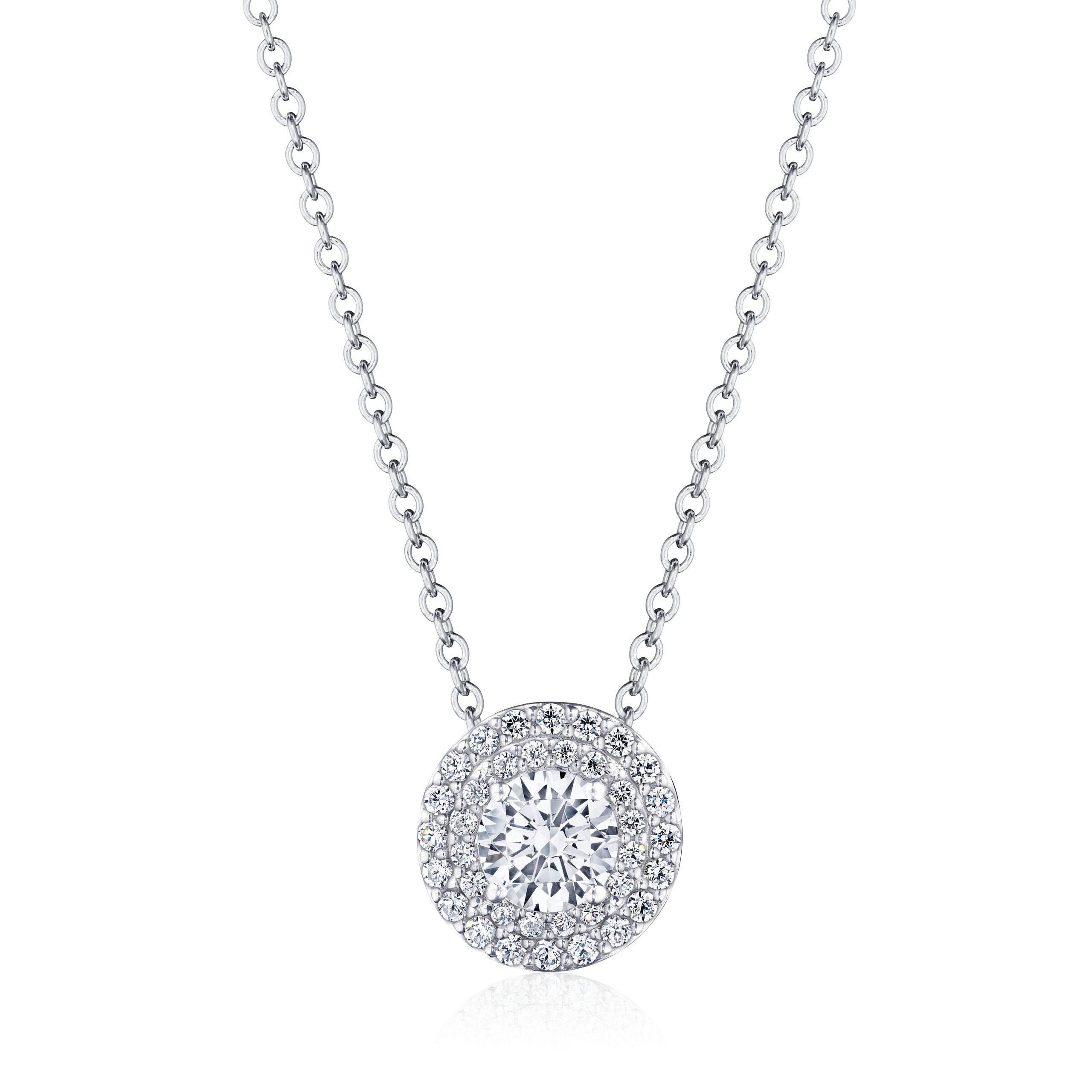 A delicate double bloom of meticulously-set diamonds illuminates the center, creating a nuanced and striking sparkle. The precision of this piece makes this clean and classic desing truly exceptional. Center diamond sold separately.