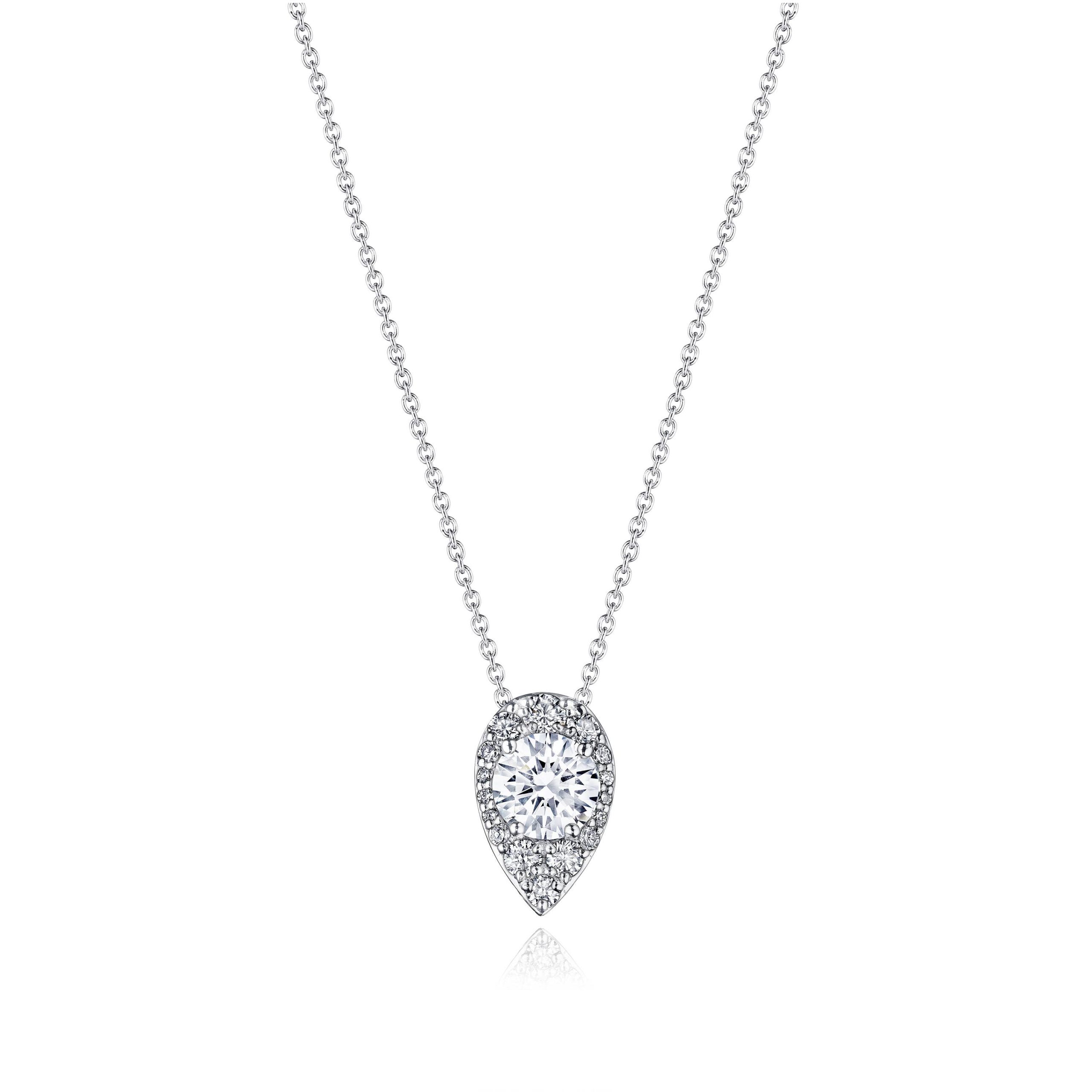 A pear bloom of spotlight diamonds is set North-South on a dainty chain, transforming the center diamond into a shape totally its own, while adding clarifying depth and dimension to the pendant. Center diamond sold separately.