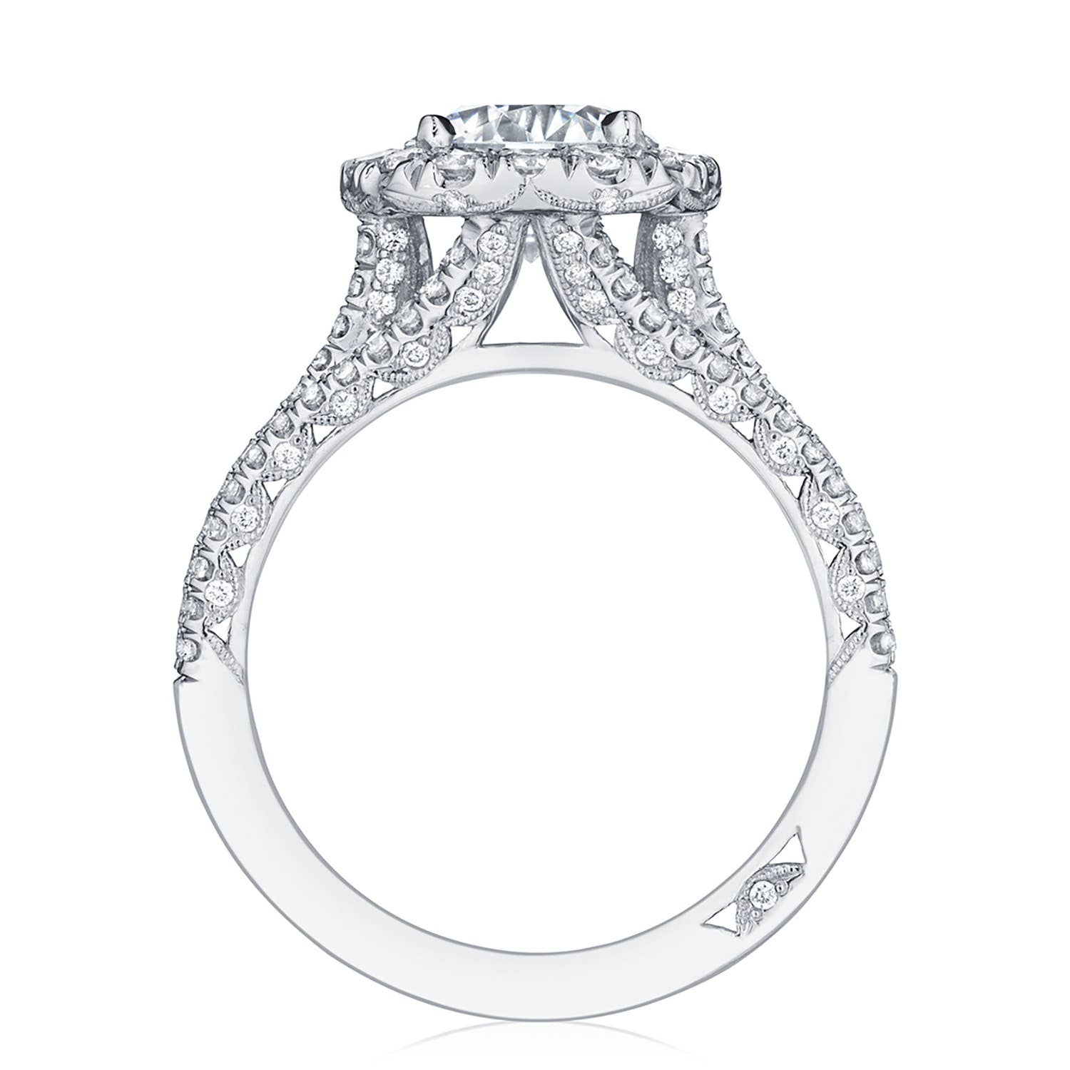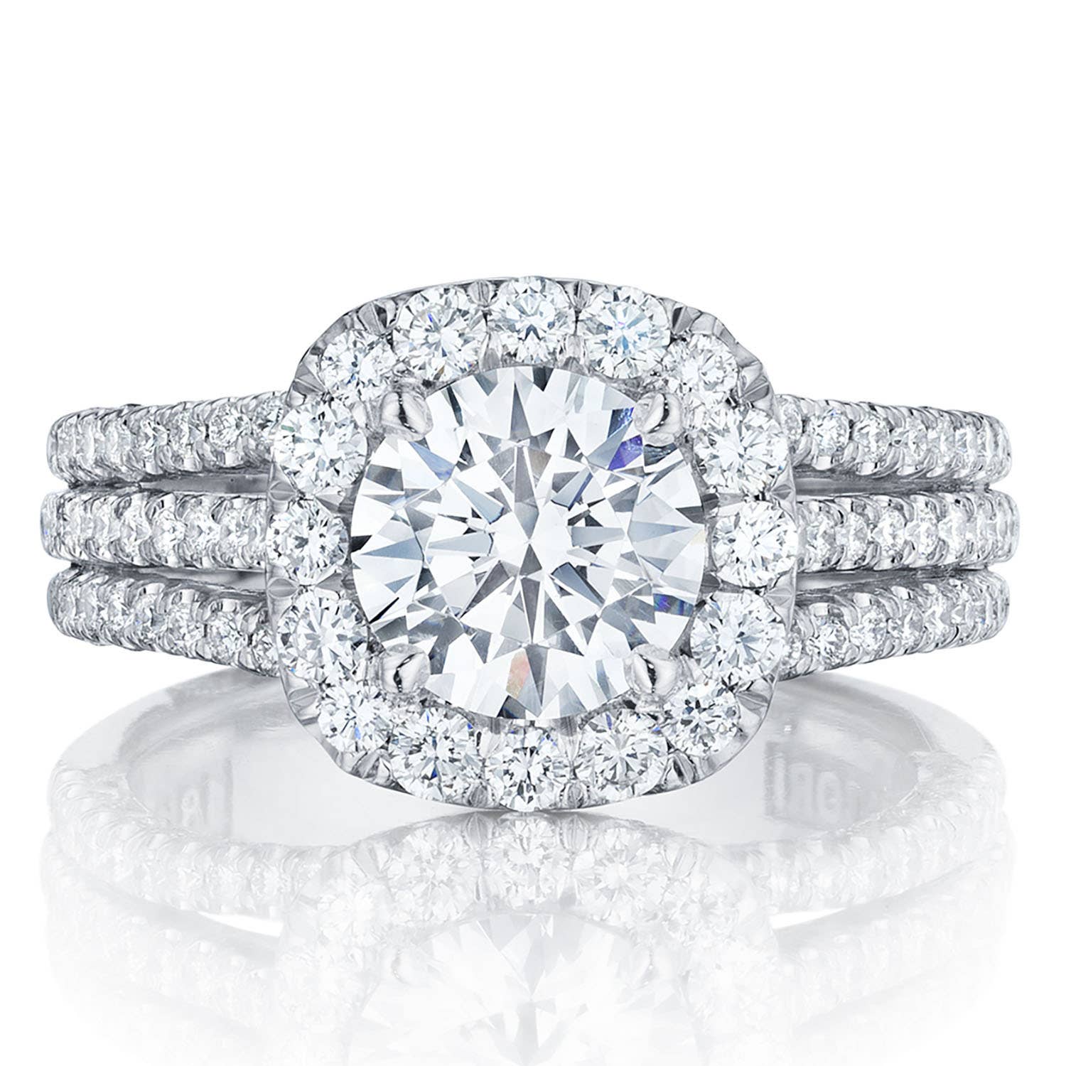A band of diamond-studded Petite Crecent fabric breaks into three diamond-studded branches, which culminate in a cushion bloom around the center stone. A Signature Crescent marks the resting point of the ring.